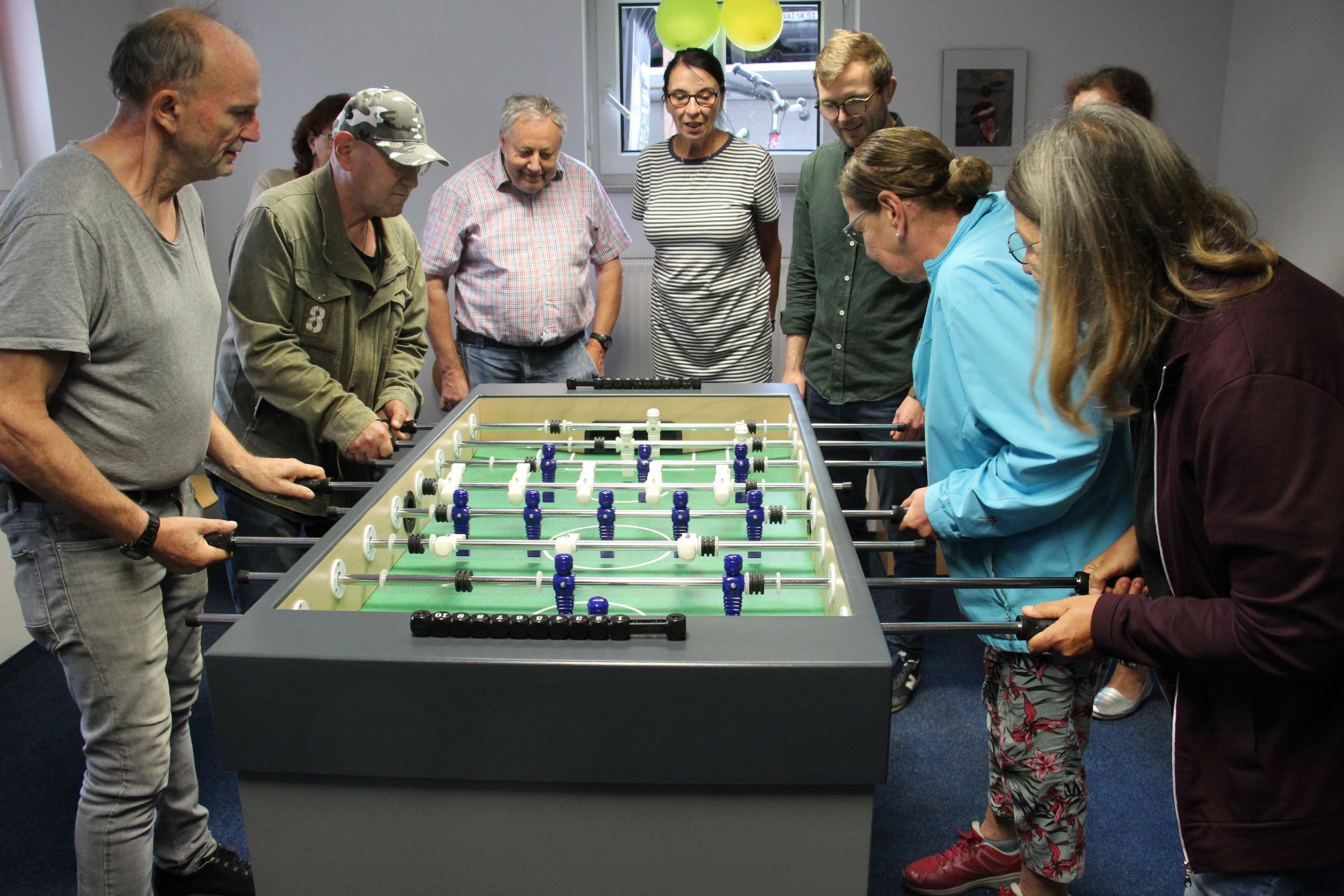 Beratungsstellenleiter Georg Frank, seit Mai Nachfolger von Irmgard Pees, konnte nun das nagelneue Gerät im Beisein zahlreicher Besuchender feierlich enthüllen. Er dankte für die vielen Spenden, dank derer die Anschaffung realisiert werden konnte. Der Tischkicker sei turniertauglich hatte man den Käufern bescheinigt. Dies wurde am Tag der Einweihung gleich auf die Probe gestellt. Die Mitarbeitenden der „Insel“ sind sich sicher, dass die Spielegruppen, die sich regelmäßig im Haus treffen, demnächst auch häufig im Untergeschoss anzutreffen sein werden gemäß dem Leitspruch der Begegnungsstätte: „Kein Mensch ist eine Insel ganz für sich allein“.